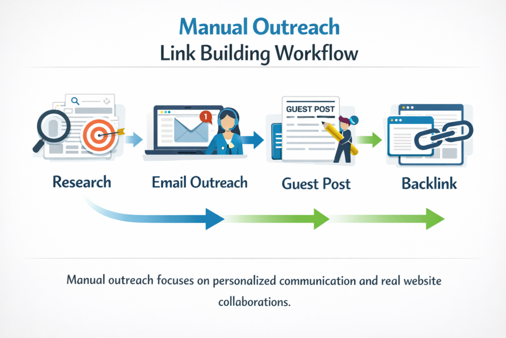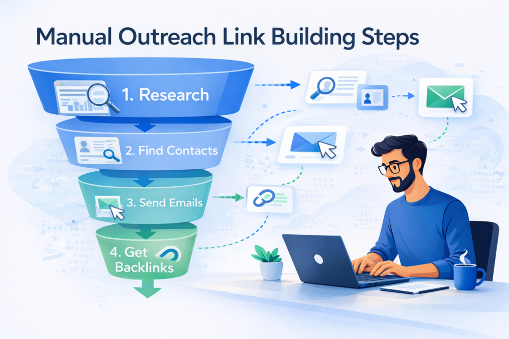 Manual outreach link building is the process of contacting website owners bloggers editors or journalists to request backlinks and collaboration.